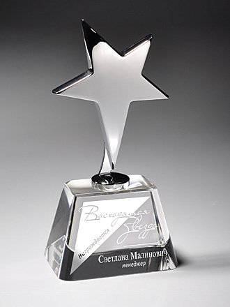 Стильная, современная статуэтка в виде звезды, выполненная из современных материалов: стекла и металла, станет не забываемым подарком для сотрудников или партнеров фирмы. Поздравительная надпись наносится на шильд, который крепиться на постаменте.