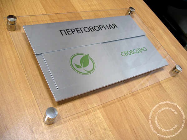 Табличка из алюминия на подложке из оргстекла. Крепится к стене на расстоянии 15 мм с помощью дистанционных держателей из стали (цвет серебристый), диаметр 14 мм. Табличка может быть размером 30х20 см или 30х15 см.